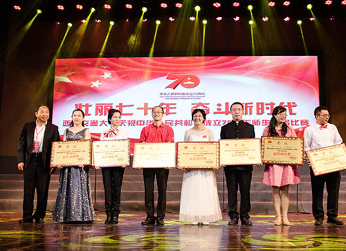 “壮丽七十年 奋斗新时代”庆祝中华人民共和国成立七十周年师生合唱比赛在九里校区学生大礼堂隆重举行。其中,师生做爱