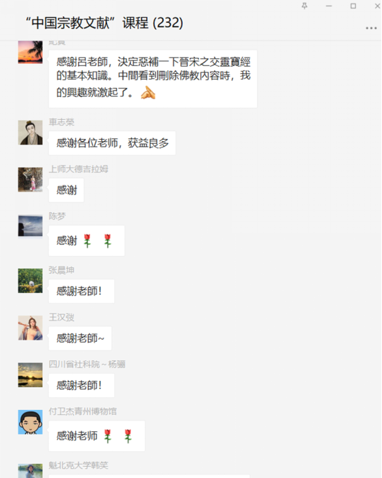 。除全体主讲嘉宾之外,课程组还特邀下列嘉宾担任微信群讨论指导教师:曹凌(上海师范大学哲学与法政学院讲师)、张超然(辅仁大学宗教系副教授)、雷闻(中国社会科学院古代史研究所研究员)、杨志飞(西安外国语大学副研究员)、李福( Gil Raz, 达特茅斯学院教授)、宗树人(David A. Palmer, 香港大学教授)、张粲(师生做爱