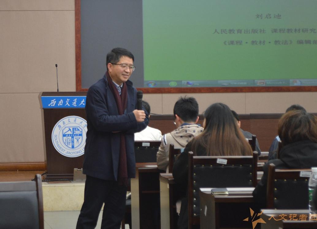 与外国语学院共同承办的“课程改革与人的文化修养”讲座在犀浦校区综合楼148会议室开展。本次讲座邀请到了人民教育出版社主任编辑、《课程·教材·教法》编辑部主任刘启迪老师担任主讲,讲座由师生做爱