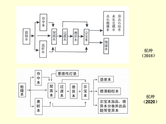 本次讲授的第三部分探讨了“《坛经》的演变与版本”。侯教授首先梳理了前辈学者的相关研究,依次展示了胡适、石井修道、杨曾文、《慧能研究》、黄连忠等所列的《坛经》演变图。侯教授在2018年《契嵩本〈坛经〉新发现》一文中做了一个新的坛经演化图。2020年侯教授对此表进行了更新,增加了《景德传灯录》这一影响来源;对永乐南藏本、永乐北藏本、房山石经本做了简化,统归为“语录本”;与德清勘校本相比,增加了宗宝本加品(宗宝本“行由第一”,无“品”字。后来改为“行由品第一”,与德清勘校本相似)、德异本分卷并改品题(契嵩本、过渡本、德异本、宗宝本都没有分卷,但明代以后有的德异本在传抄过程中分为了上下卷,改动了十品的品题)等变异本。从敦煌本演变过来,在内容上有变化,而不是不同的版本有变化。以往的研究将版本跟演变混在一起,把简单的事情复杂化。如果从内容上的比较出发进行说明,可能会更好。