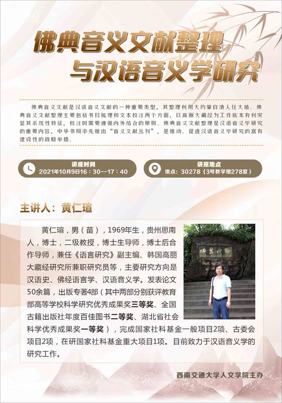 主讲人简介:黄仁瑄,男(苗),1969年生,贵州思南人,博士,二级教授,博士生导师,博士后合作导师,兼任《语言研究》副主编、韩国高丽大藏经研究所兼职研究员等,主要研究方向是汉语史、佛经语言学、汉语音义学。发表论文50余篇,出版专著4部(其中两部分别获评教育部高等学校科学研究优秀成果奖三等奖、全国古籍出版社年度百佳图书二等奖、湖北省社会科学优秀成果奖一等奖),完成国家社科基金一般项目2项、古委会项目2项,在研国家社科基金重大项目1项。目前致力于汉语音义学的研究工作。