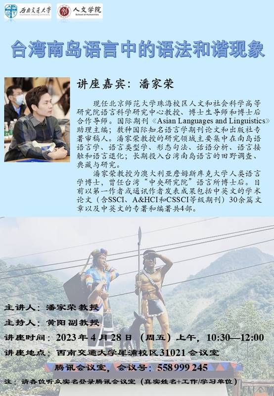 摘要:语言学家Blust(1984-1985)和考古学家Bellwood(1991)相继提出台湾地区是南岛语言的起源地的观点。Zeitoun和Teng(2016)也指出台湾南岛语言是南岛语系中最能体现语言多样性的所在地,也是构拟古南岛语言的关键。因此,台湾南岛语言研究的重要性不言可喻。本报告主要以讲者长期田野调查的邹语(Tsou)和拉阿鲁哇语(Saaroa)为例介绍这些语言的特殊语法和谐现象。基于语料事实,从类型学视角通过(一)焦点、(二)副动词,以及(三)动词性前缀的语法和谐来探讨它们的形式、分布和功能的相同点和差异性。本报告旨在考察台湾南岛语言中语法和谐现象的语言类型学特征,然而,这些分析仍存在讨论和完善的空间。