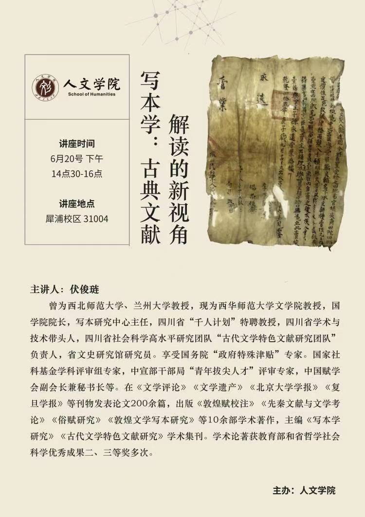【主讲人简介】伏俊琏,曾为西北师范大学、兰州大学教授,现为西华师范大学文学院教授,国学院院长,写本研究中心主任,四川省学术与技术带头人,四川省社会科学高水平研究团队“古代文学特色文献研究团队”负责人,省文史研究馆研究员。享受国务院“政府特殊津贴”专家。主要社会兼职有:国家社科基金学科评审组专家,中宣部干部局“青年拔尖人才”评审专家,中国赋学会副会长兼秘书长等。在《文学评论》《文学遗产》《北京大学学报》《复旦学报》等刊物发表论文200余篇,出版《敦煌赋校注》《先秦文献与文学考论》《俗赋研究》《敦煌文学写本研究》等10余部学术著作,主编《写本学研究》《古代文学特色文献研究》学术集刊。学术论著获教育部和省哲学社会科学优秀成果二、三等奖多次。