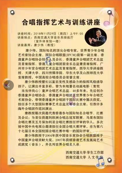 唐少伟,国际知名的顶尖合唱专家,世界青少年合唱艺术家协会主席、国际合唱联盟(IFCM)前第一副主席、香港童声合唱协会创办人及会长、香港童声合唱团艺术总监及首席指挥、香港儿童合唱团前音乐总监兼首席指挥、广州市少年宫合唱团艺术总监及首席指挥,西华大学讲座教授、天津大学、四川传媒学院、华东大学及山西师范大学客席教授,中国高校合唱委员会荣誉主席。
