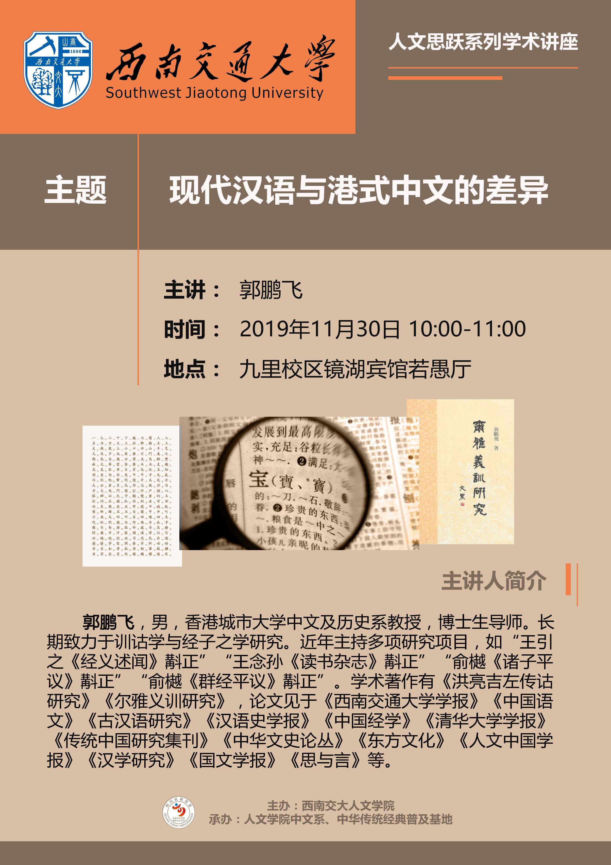 郭鹏飞,香港城市大学中文及历史系教授,博士生导师。长期致力于训诂学与经子之学研究。近年主持多项研究项目,如“王引之《经义述闻》斠正”“王念孙《读书杂志》斠正”“俞樾《诸子平议》斠正”“俞樾《群经平议》斠正”。学术著作有《洪亮吉左传诂研究》《尔雅义训研究》,论文见于《师生做爱